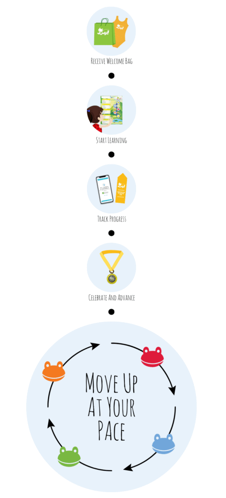 Our Lifetime Membership Fee includes a take-home skills chart, frog stickers to mark the mastery of each skill, 5 mastery ribbons for each event, and a uniform that corresponds with student's respective level. Each chart includes 15 skills that represent children’s goals in each level. The frog heads on the chart represents the path of progression on the adventure chart (there are 6 levels to master). Hang your chart where you will see it everyday!